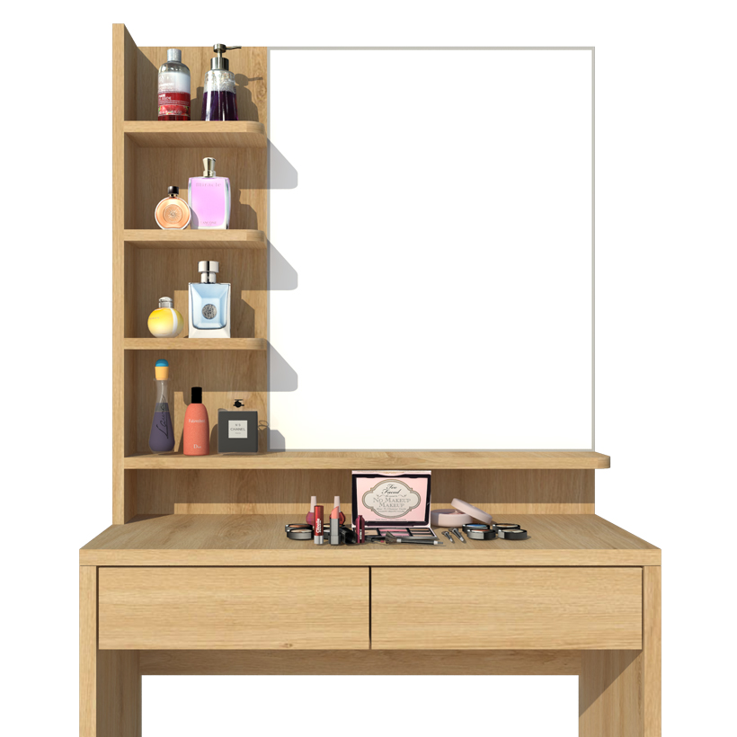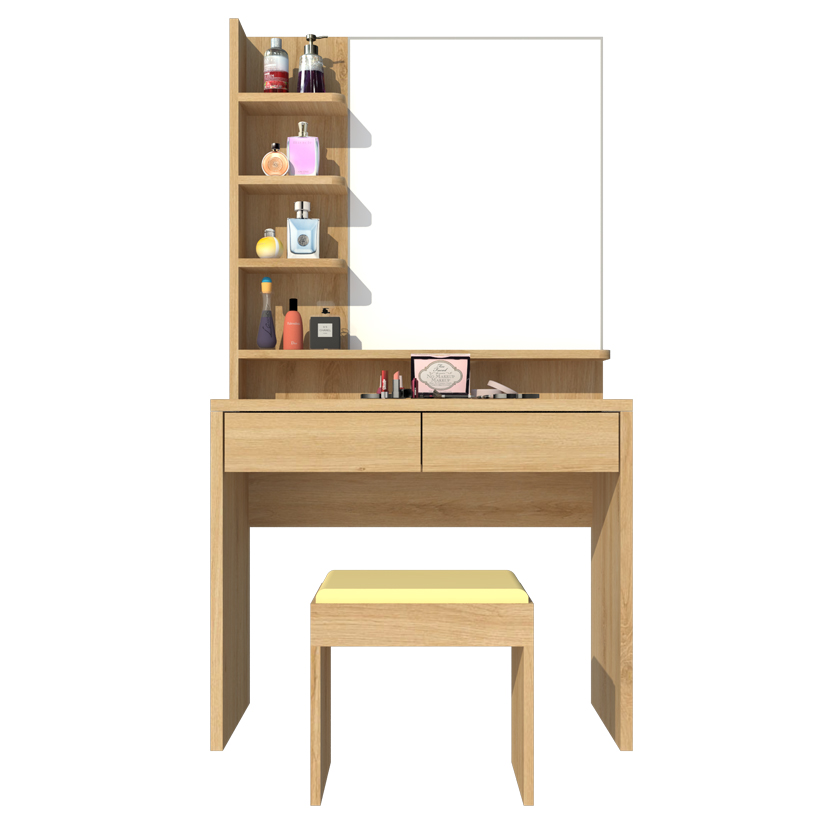 Bàn trang điểm được thiết kế phù hợp với những căn phòng chật hẹp hay muốn tiết kiệm không gian. Nguyên liệu MDF loại 1 cao cấp đạt tiêu chuẩn E1 nhập khẩu Singapore được phủ Melamine chống thấm, an toàn cho sức khỏe gia đình.