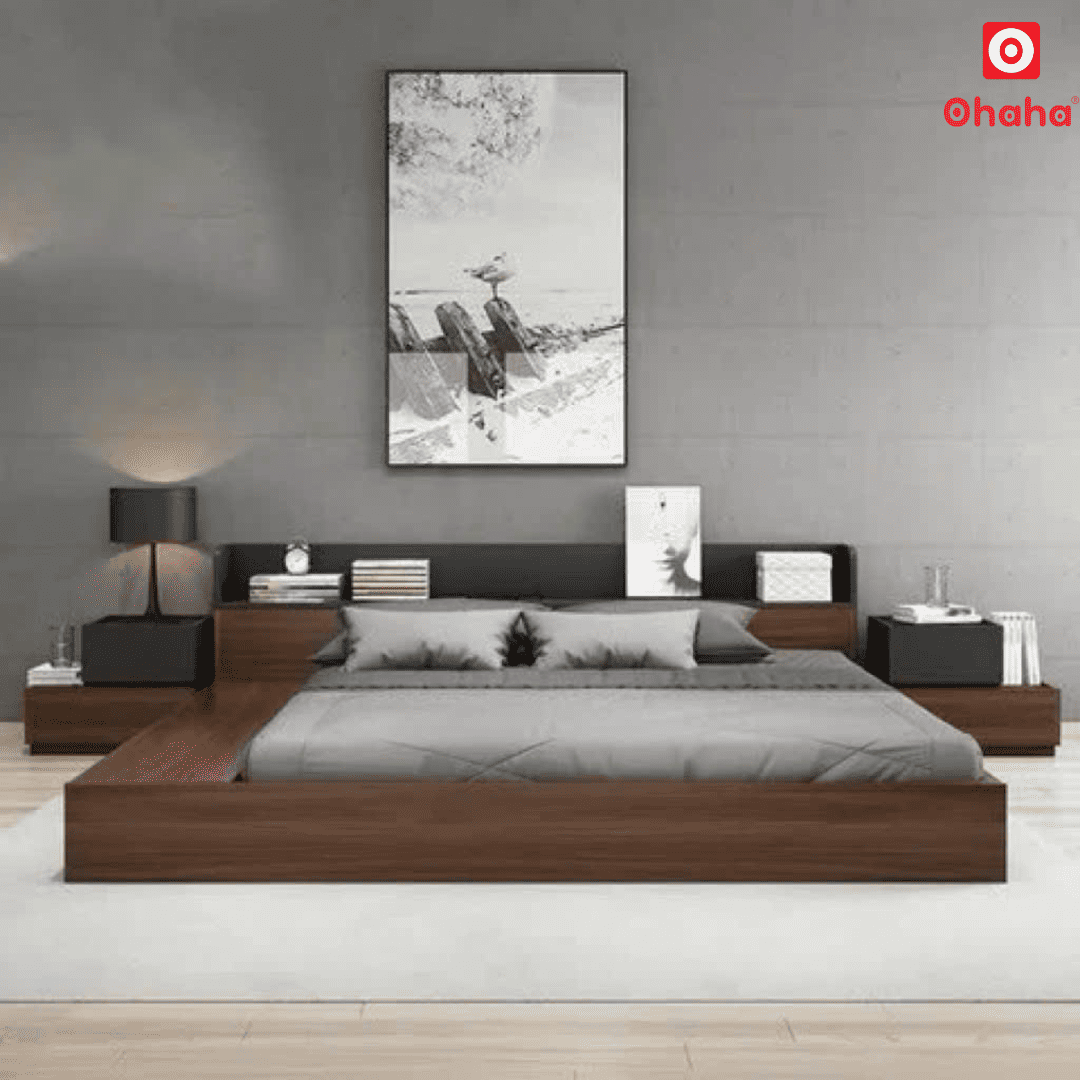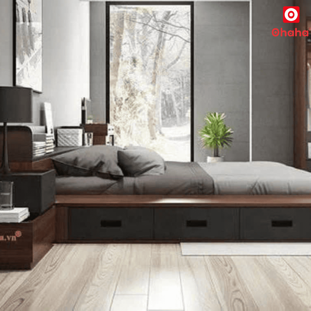 Giường ngủ bệt kiểu Nhật kèm tủ đầu giường và hộc kéo Ohaha - GB004 là 1 mẫu giường hiện đại với thiết kế thông minh nhưng không kém phần sang trọng và bắt mắt. Đặc trưng phổ biến của mẫu giường ngủ bệt gỗ công nghiệp kèm tủ đầu giường là với độ cao vừa phải được đặt sát xuống sàn nhà giúp không gian trở nên thoáng mát, đặc biệt điểm nhấn là tủ đầu giường mang đậm phong cách Bắc Âu.