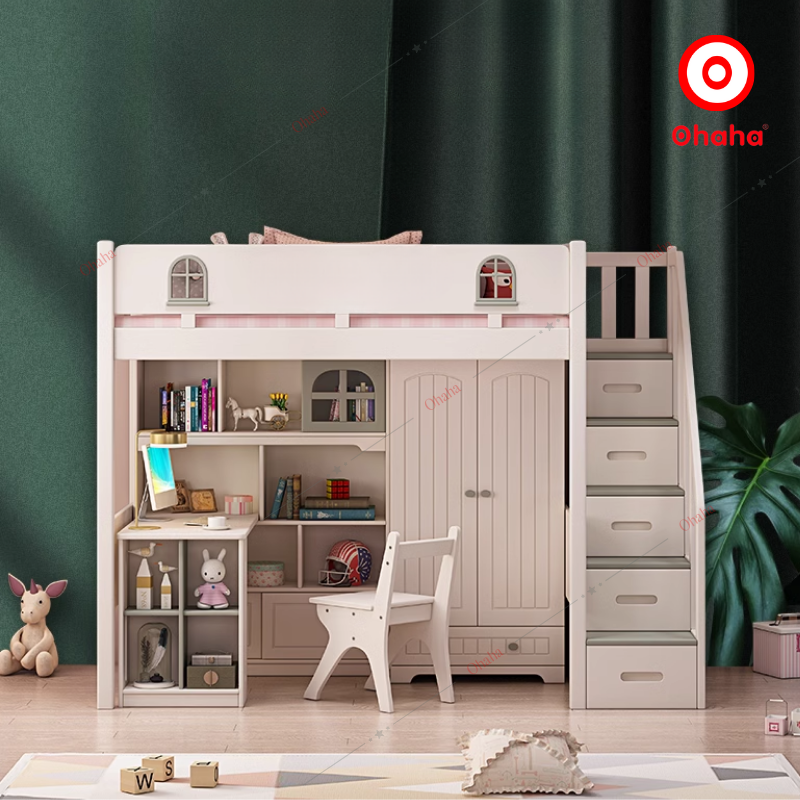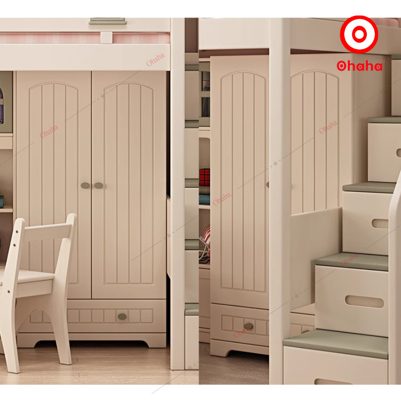 Giường tầng thông minh cao cấp Ohaha có tủ áo và bàn học - GTCC026 là mẫu giường tầng cao cấp được rất nhiều khách hàng yêu thích bởi thiết kế sang trọng tích hợp nhiều tính năng thông minh như bàn học, kệ trang trí, tủ áo,...