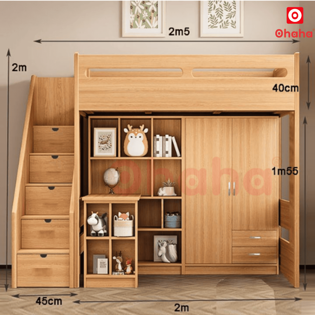 Giới thiệu Giường tầng thông minh cao cấp Ohaha - GTCC015 có thiết kế kèm tủ quần áo, bàn học và kệ trang trí cho bé giúp tiết kiệm không gian, tối ưu cho phòng ngủ của bạn.