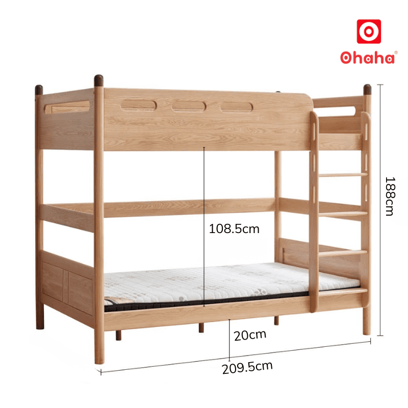 Giường trên với giường dưới gắn kết với nhau bằng cầu thang leo đầy chắc chắn. Giường tầng thiết kế mang phong cách scandivian nhẹ nhàng, thanh lịch pha chút tân cổ điển sang trọng.