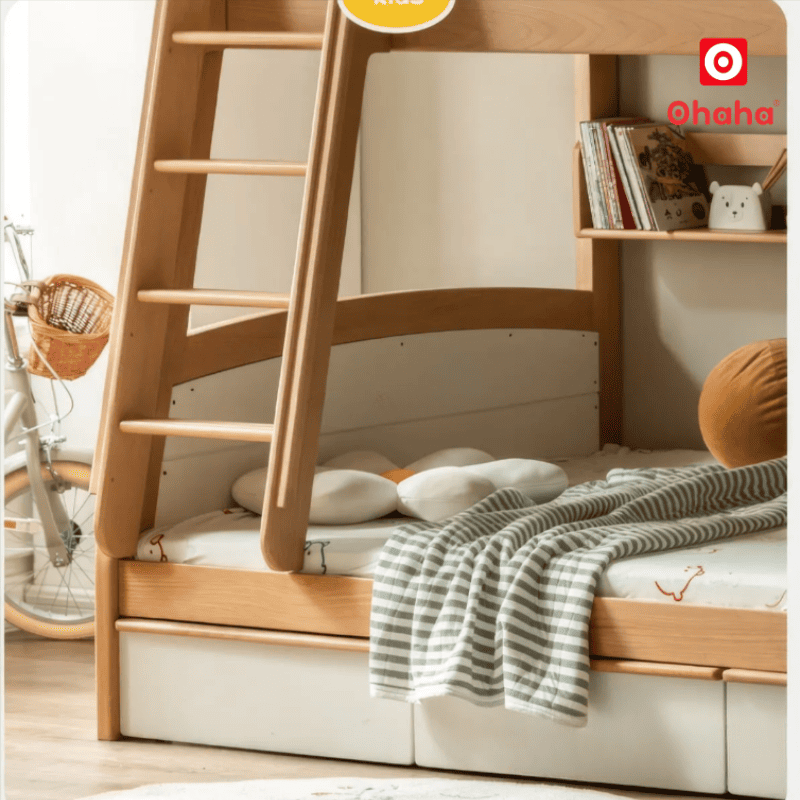 Giường tầng Ohaha – GTTM061 được thiết kế theo phong cách hiện đại với các đường cong mềm mại, màu gỗ sáng ấm, tạo cảm giác nhẹ nhàng và thân thiện. Thành chắn tầng trên cao, chắc và kín giúp bé ngủ an toàn, bố mẹ hoàn toàn yên tâm mỗi đêm.
