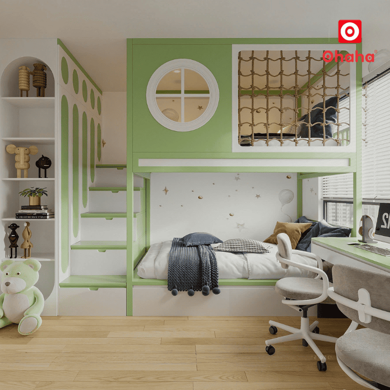 Thiết kế giường tầng thông minh hiện đại giúp phòng ngủ không chỉ là nơi nghỉ ngơi mà còn là không gian để bé học tập và vui chơi.