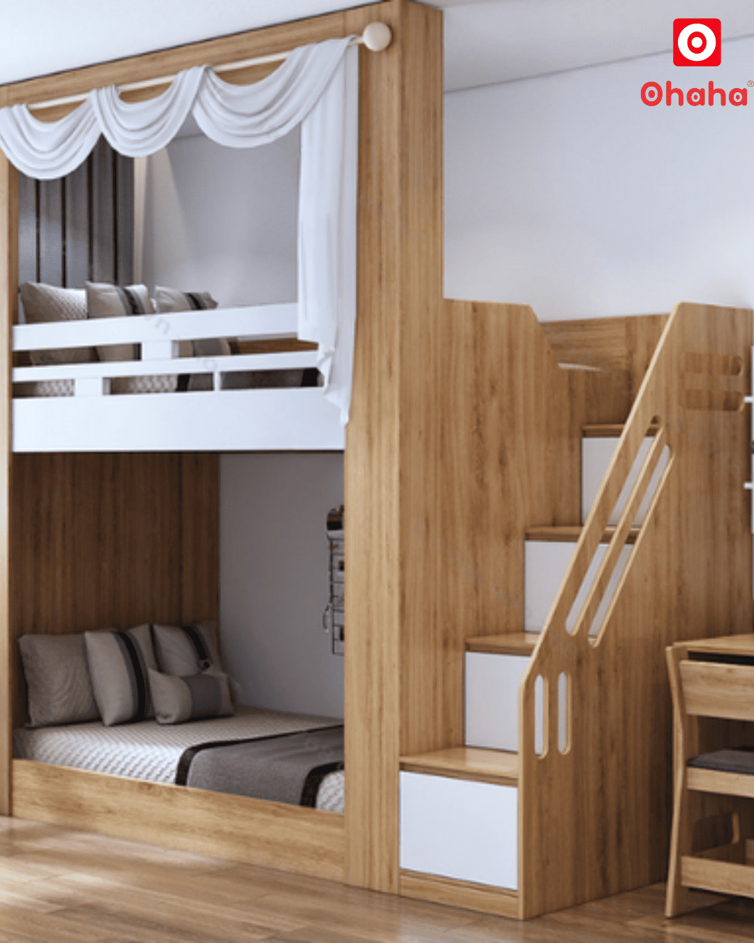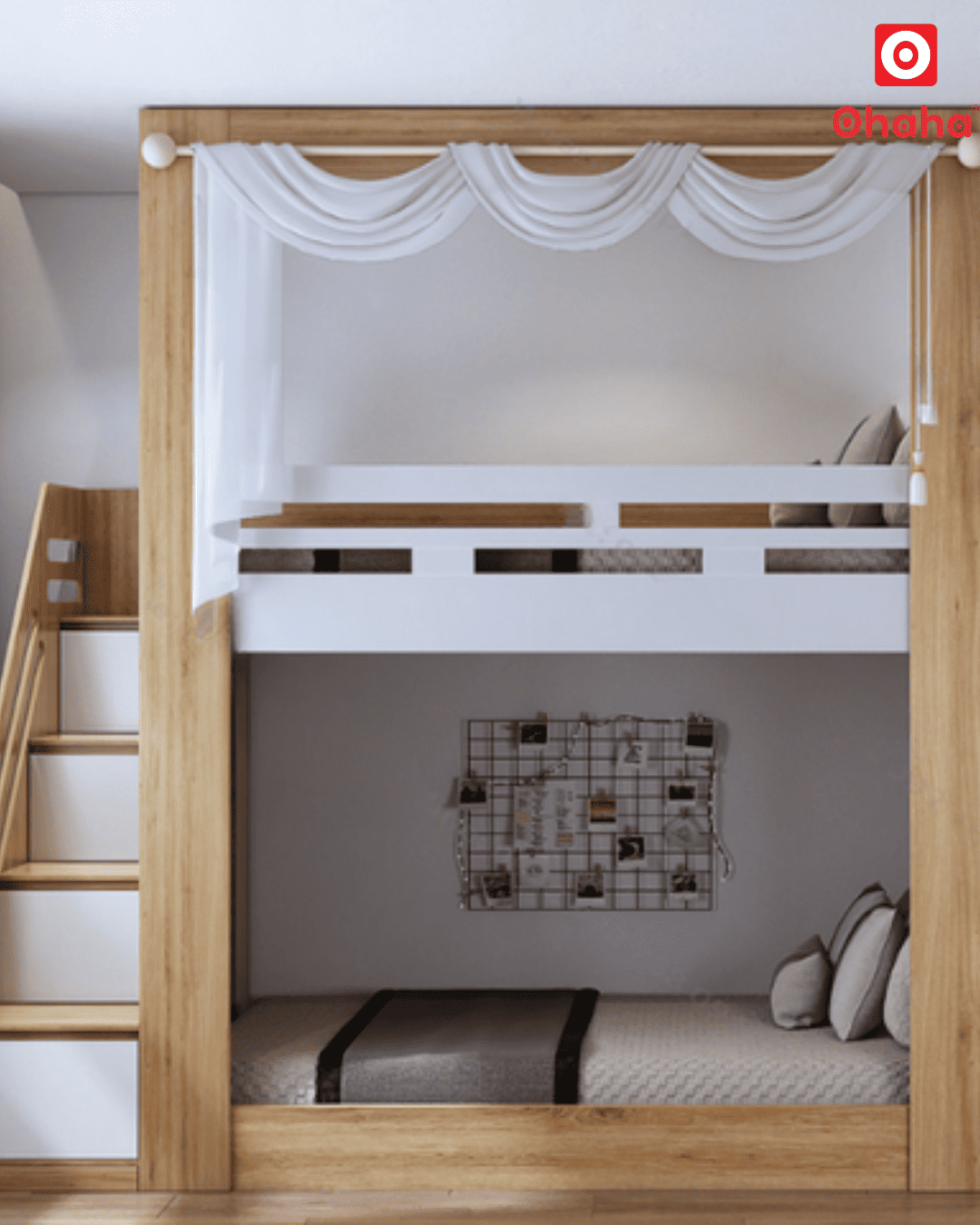 Giường tầng thông minh đa năng Ohaha - GTĐN004 được thiết kế dạng giường bệt, giảm bớt các chi tiết, nâng cao khoảng cách trần tầng 1 và tầng 2 giúp tầm nhìn thoáng hơn.