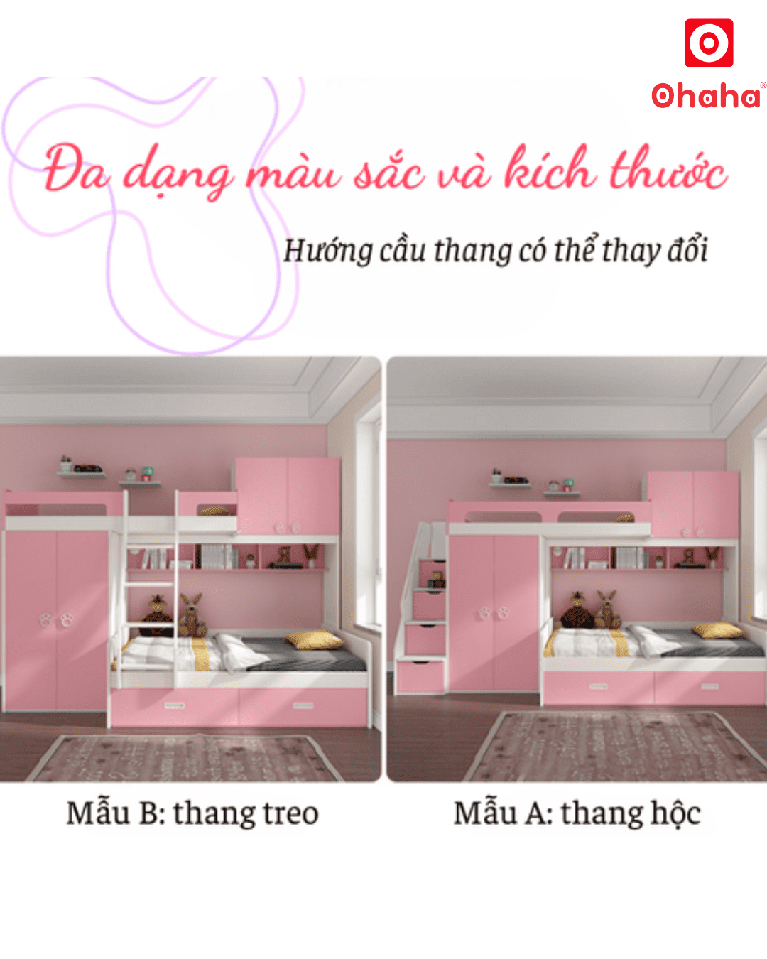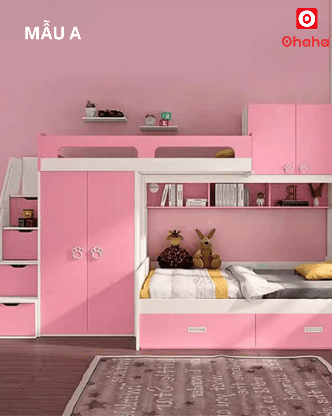 Giường tầng thông minh Ohaha - GTTM002 là mẫu giường được rất nhiều bé gái yêu thích bởi thiết kế ngọt ngào, đáng yêu và tích hợp nhiều công năng hiện đại, thông minh.