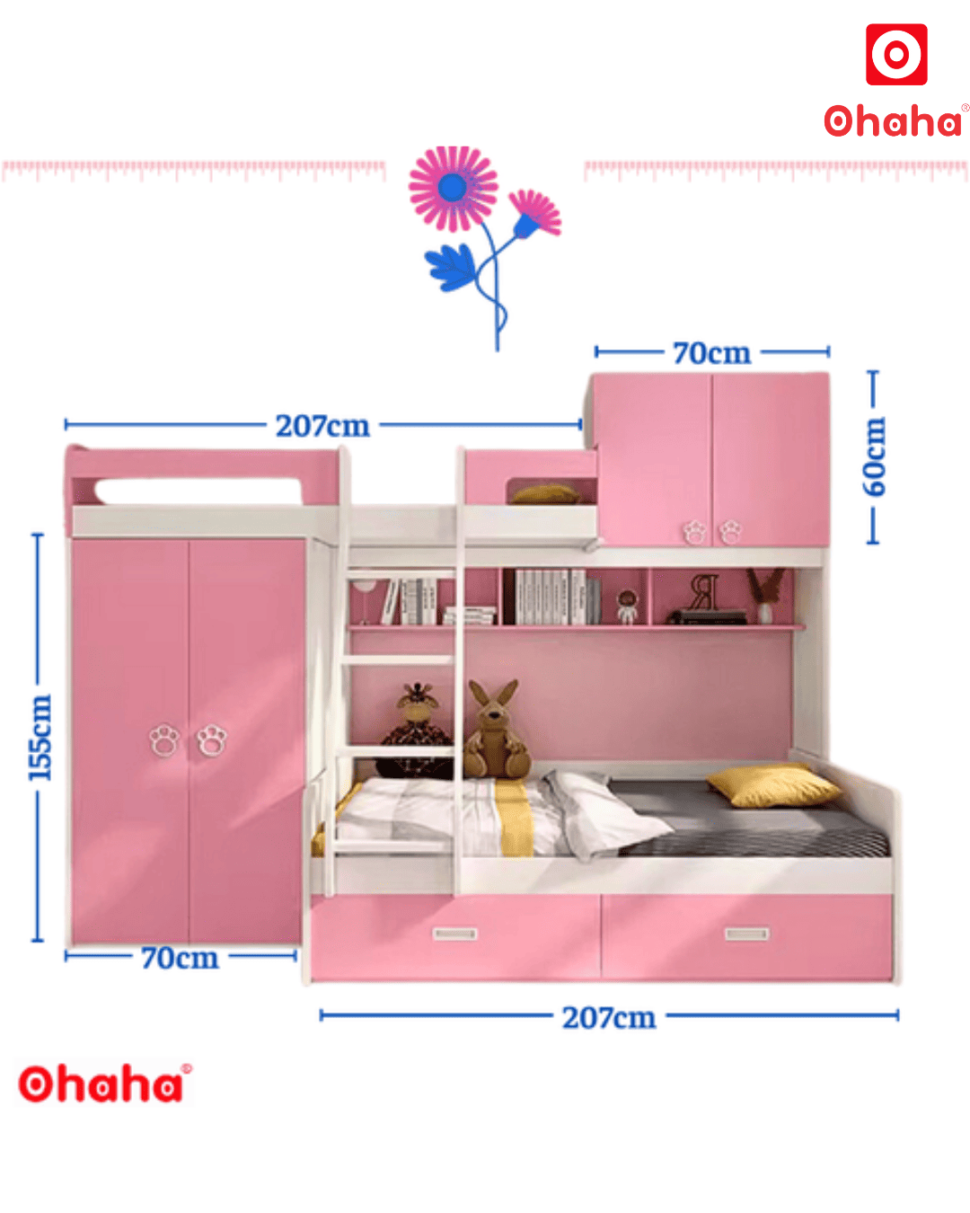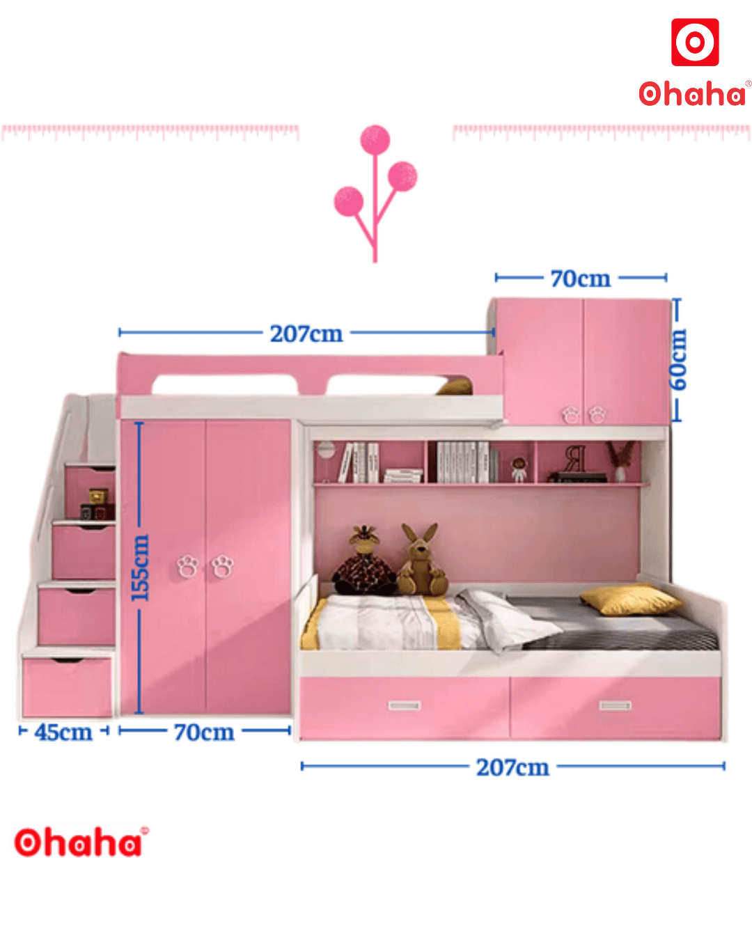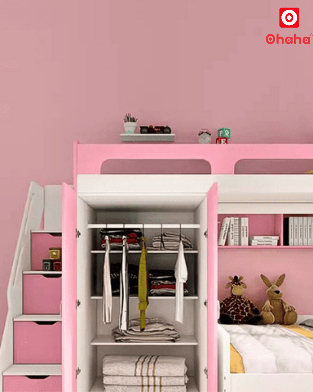 Mẫu giường tầng thông minh Ohaha - GTTM002 sở hữu thiết kế đáng yêu, ngọt ngào phù hợp với các bé gái, đồng thời cũng mang đến nhiều công năng hữu dụng. Chỉ trong một sản phẩm, bạn có thể tận dụng được nhiều món đồ nội thất mà lại không chiếm quá nhiều diện tích không gian.