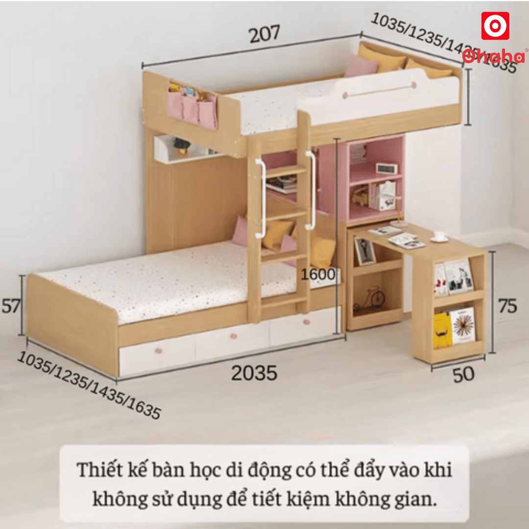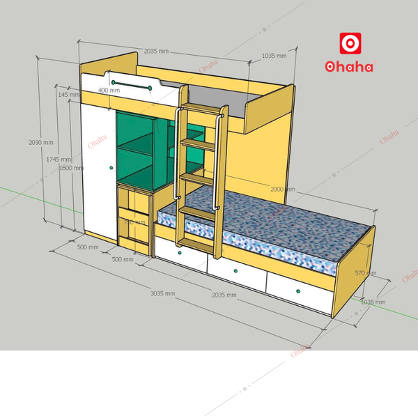 Mẫu Giường tầng thông minh Ohaha kết hợp tủ áo và kệ sách - GTTM016 sở hữu thiết kế thông minh phù hợp với các căn phòng có không gian hạn chế, đồng thời cũng mang đến nhiều công năng hữu dụng. Chỉ trong một sản phẩm, bạn có thể tận dụng được nhiều món đồ nội thất mà lại không chiếm quá nhiều diện tích không gian.