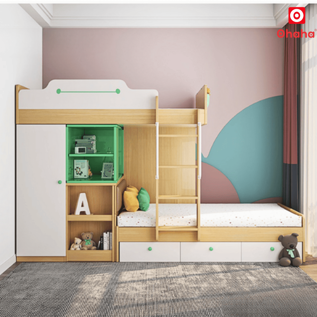 Giường tầng thông minh Ohaha kết hợp tủ áo và kệ sách - GTTM016 được làm từ chất liệu gỗ MDF lõi xanh nhập khẩu, bề mặt phủ Melamine 2 mặt chống ẩm tốt.