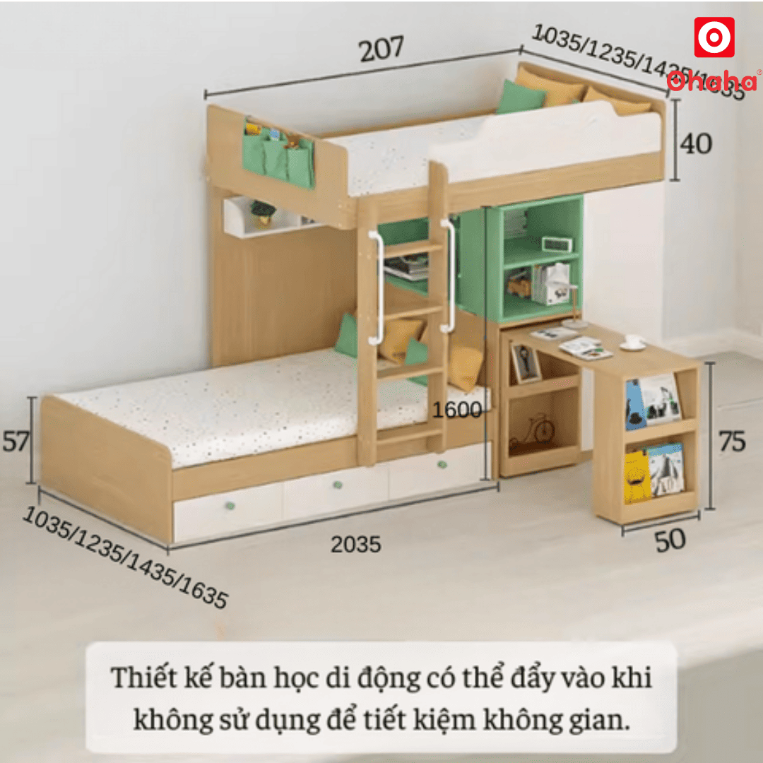 Giường tầng thông minh Ohaha kết hợp tủ áo và kệ sách - GTTM016 được thiết kế tiện dụng, tiết kiệm diện tích và chắc chắn, an toàn cho cả người lớn và trẻ nhỏ khi nằm. Đây là sự lựa chọn ưu việt cho không gian nội thất phòng ngủ nhỏ hẹp. Mẫu sản phẩm đầy đủ tiện nghi với nhiều không gian lưu trữ đồ đạc: tủ quần áo, bàn học, kệ sách,...
